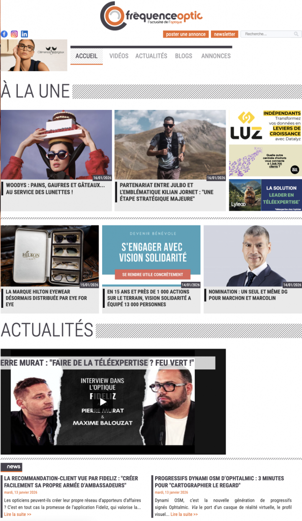 Devant l’importance grandissante d’Internet et la richesse de l’actualité du secteur de l’optique, Presse Optic, société éditrice de Vison’ère, anime frequenceoptic.fr. Un site d’informations et d’échanges, ergonomique et convivial, qui offre un accès à un contenu éditorial varié.